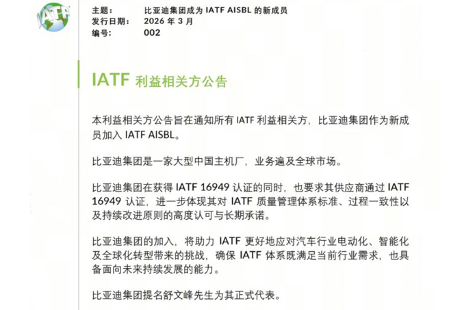 IATF是全球汽车质量管理体系的权威组织,长期以来成员以欧美车企为主,如宝马集团、福特汽车公司、通用汽车、大众汽车公司、沃尔沃集团等。此次比亚迪经汽车工业行动集团(AIAG)提名推荐,并经IATF全体成员投票通过,正式成为行业标准制定者的一员,既彰显中国汽车产业的全球影响力,也印证其核心技术与质量管理水平获国际认可。IATF官方公告称:“比亚迪集团的加入,将助力IATF更好地应对汽车行业电动化、智能化及全球化转型带来的挑战,确保IATF体系既满足当前行业需求,也具备面向未来持续发展的能力。”