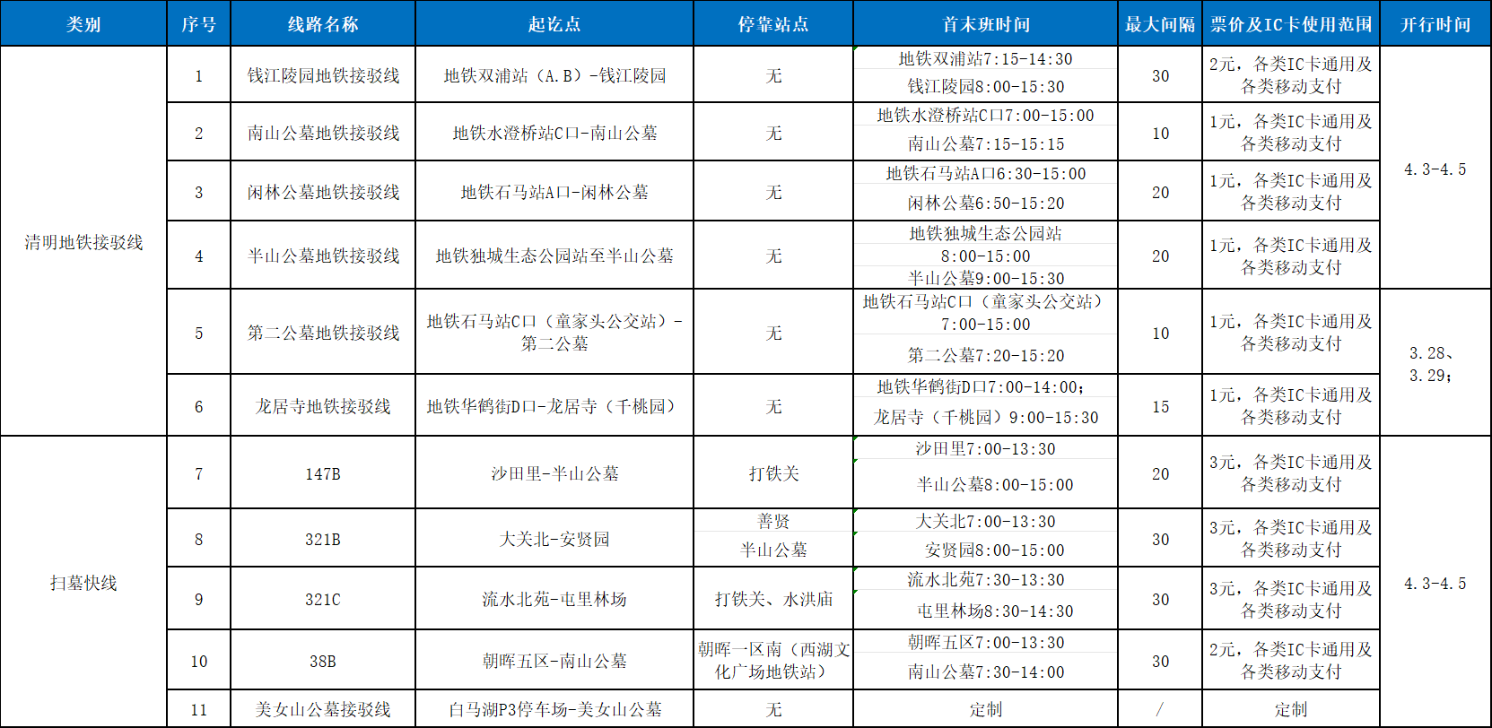 1.开通11条清明扫墓专线,全面覆盖9座主要公墓,其中6条地铁接驳线、5条扫墓快线,实现地铁与公墓点对点直达、一站式接驳,最大限度方便市民祭扫出行。