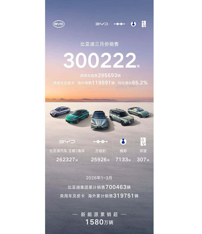 4月1日,比亚迪发布2026年3月产销数据,单月总销量达300222辆,强势突破30万辆大关,斩获中国车企销量冠军,并连续58个月蝉联中国新能源汽车销量冠军。截至目前,比亚迪新能源汽车累计销量已超1580万辆,一季度累计销售700463辆,以硬核数据印证技术与规模双重实力。