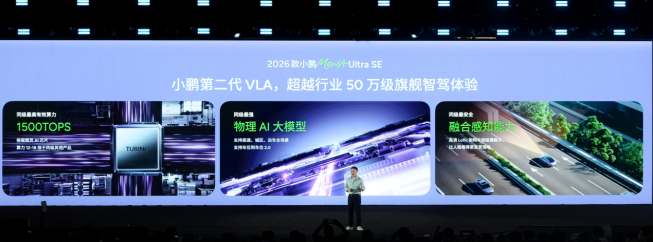 智能驾驶部分,新车提供Max与Ultra SE双算力版本。Ultra SE版搭载双图灵AI芯片,有效算力1500TOPS,配备小鹏第二代VLA。Max版搭载单颗图灵AI芯片,有效算力750TOPS,采用第一代VLA,2026年第三季度将推送第二代VLA蒸馏版。车辆支持全场景NGP、智能泊车、车位到车位、循轨倒车等功能。智能座舱搭载天玑AIOS 6.0系统,采用驭光UI设计,配备全国通用3D车道级导航、15.6英寸2.5K大屏,接入40余款娱乐应用及腾讯云游戏生态。