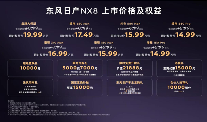 上市权益八重礼同步公布,包括超级置换礼:4月30日前下订直减10000元,叠加优惠后,东风日产NX8上市限时权益价为14.99-17.49万元;限时定购礼:4月12日前支付5000元定金可抵7000元;限时免费升舱礼:免费赠送后排133°电动大躺椅、全遮光电动遮阳帘、墨海蓝外观色;选装礼:零压舒享套装、全景视听套装、时尚光幕套装,限时超低价;以及无忧用车礼、国家置换补贴、东风日产车主复购礼、合伙人推荐礼等。