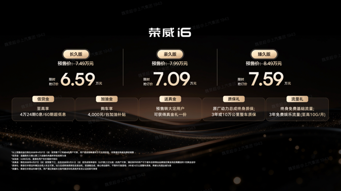 4月13日,国民级家轿荣威i6正式开启预售,共推出三款车型,分别是长久版、豪久版、臻久版,限时抢订价6.59万-7.59万,至高享4万24期0息/60期超低息,4,000元/台加油补贴,原厂动力总成终身质保。预售转大定,在5月底前锁单提车的用户送足金金钞。
