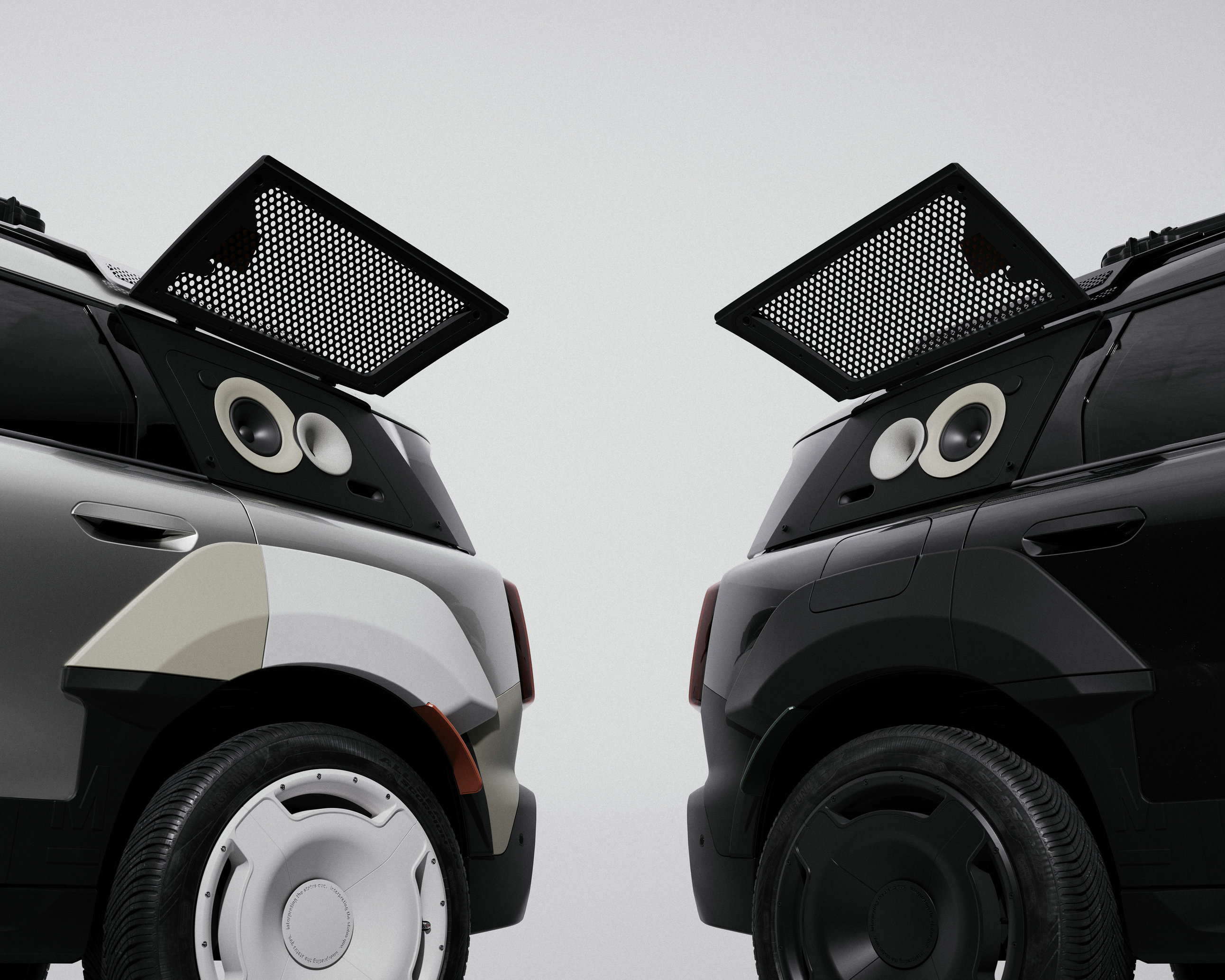 作为“移动的声场”,展车移除后侧车窗,嵌入专业级户外定制音响系统。核心音箱采用“铸造聚合物花岗岩”材质,具备极佳声学惰性与防潮耐候性,可应对户外极端环境。多个高低音音箱分置车身各处,尾门打开时低音效果更震撼,单车可作独立音响系统,两台协同可营造户外派对现场,同时车身还嵌入复古随身听,实现先锋与怀旧的碰撞。