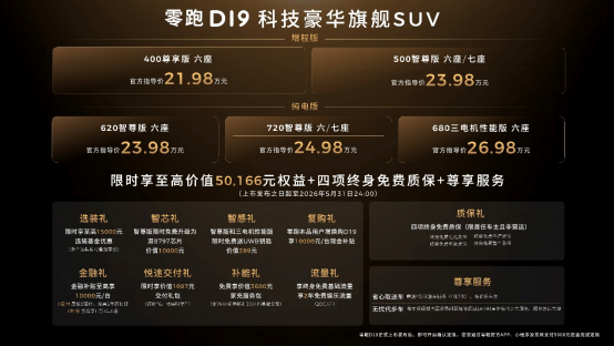 据悉,即日起至2026年5月31日24:00,下定零跑D19的用户可享受选装、智芯、智感等十大类限时权益,总价值最高达50166元。零跑汽车自2015年成立以来坚持全域自研,核心零部件自研自造占比超65%。2025年,零跑全年交付新车596555台,连续两年销量翻倍,位居中国新势力榜首,同时实现年度盈利,净利润达5.4亿元,为D平台及D19车型的推出奠定了基础。