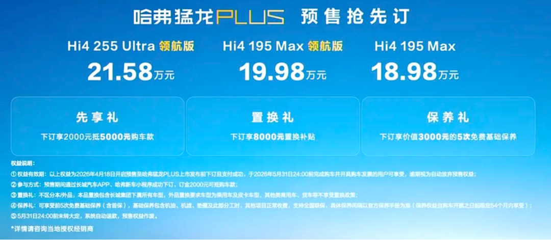 4月18日,哈弗品牌旗下中大型SUV——猛龙PLUS正式开启预售,预售价区间为18.98万至21.58万元。