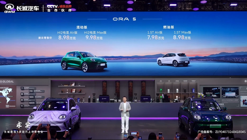 4月25日,2026北京车展上,长城汽车旗下品牌欧拉5的燃油版和混动版车型正式上市,起售价分别为7.98万元和8.98万元,限时换新价更低至6.98万元起。