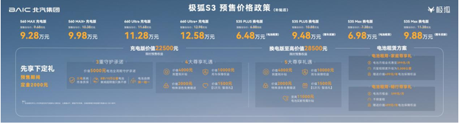 4月24日,2026北京国际车展,极狐汽车携大空间越级纯电家轿极狐S3亮相并正式开启预售,提供充电与换电两个版本,共推出三种续航多款配置车型,预售价格补贴后6.48万元-12.58万元。