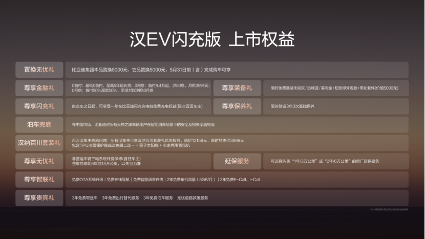 同时,比亚迪还为用户准备了置换无忧礼、1年免费闪充权益、0首付/0利息/0月供任选其一的金融礼、3年3次基础保养、包含3年免费取送车的尊享贵宾礼等共11项权益。针对追求个性的用户,官方推出价值超1.2万元的“汉纳百川”进阶生活套装,限时特惠价仅需3999元。