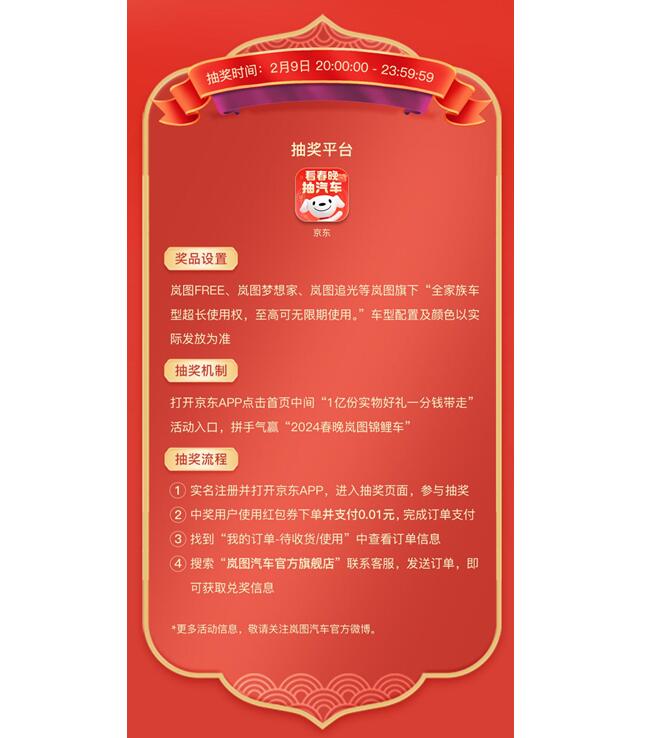 2月9日晚8点开始,除夕看春晚,观众朋友们只需登录京东APP,点击首页中间“1亿份实物好礼一分钱带走”活动入口,拼手气赢“2024春晚岚图锦鲤车”,即有机会抽取100辆岚图汽车实物好礼。此外,岚图汽车官方平台会不断发布最新动态,欢迎广大用户及时关注并参与抽奖活动。