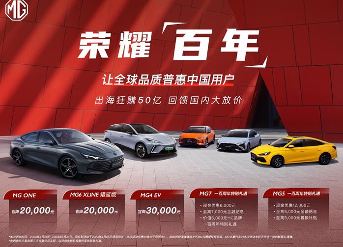 此次“荣耀百年”回馈活动, 全球首款电动钢炮MG4 EV官方直降3万元,品质潮玩SUV MG ONE和潮能玩家之选MG6 XLINE猎鲨版官方直降2万元,至美B级轿跑MG7一百周年特别礼遇1.8万元,MG5一百周年特别礼遇2.2万元。