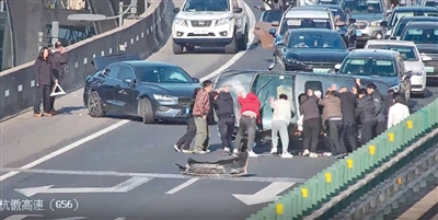 车辆扶正后,才发现左前轮严重受损,无法正常行驶。为尽快打通车道,陈海鹏再次指挥大家从侧面和后方发力,众人硬生生将侧翻车一米一米地推至硬路肩安全位置。