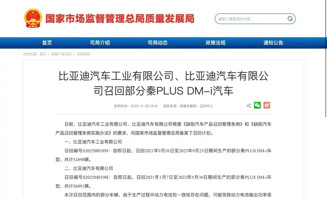 召回编号S2025M0190I:自即日起,召回2021年1月7日至2022年9月30日期间生产的部分秦PLUS DM-i车型,共计36091辆。