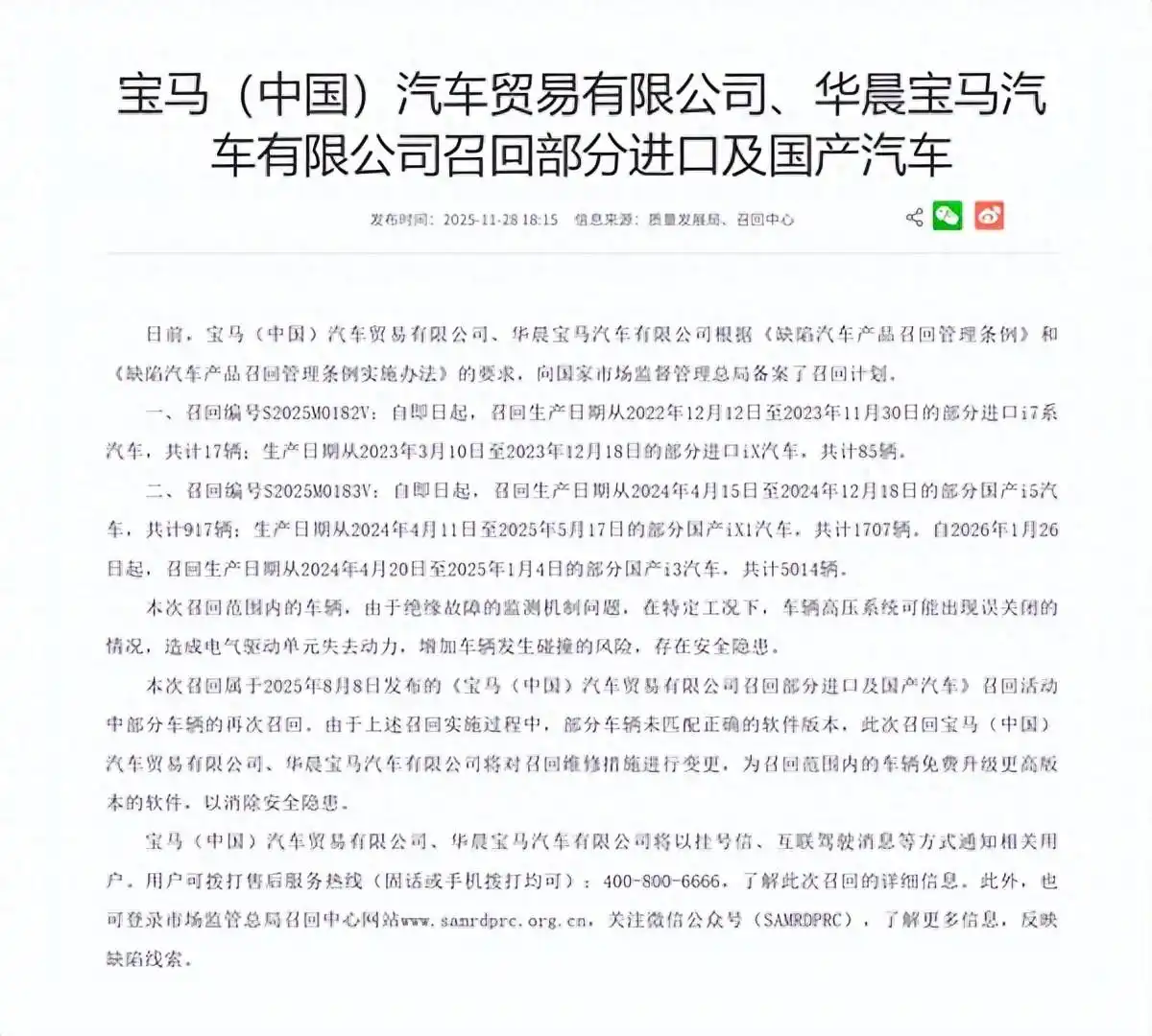 一、召回编号S2025M0182V:自即日起,召回生产日期从2022年12月12日至2023年11月30日的部分进口i7系汽车,共计17辆;生产日期从2023年3月10日至2023年12月18日的部分进口iX汽车,共计85辆。