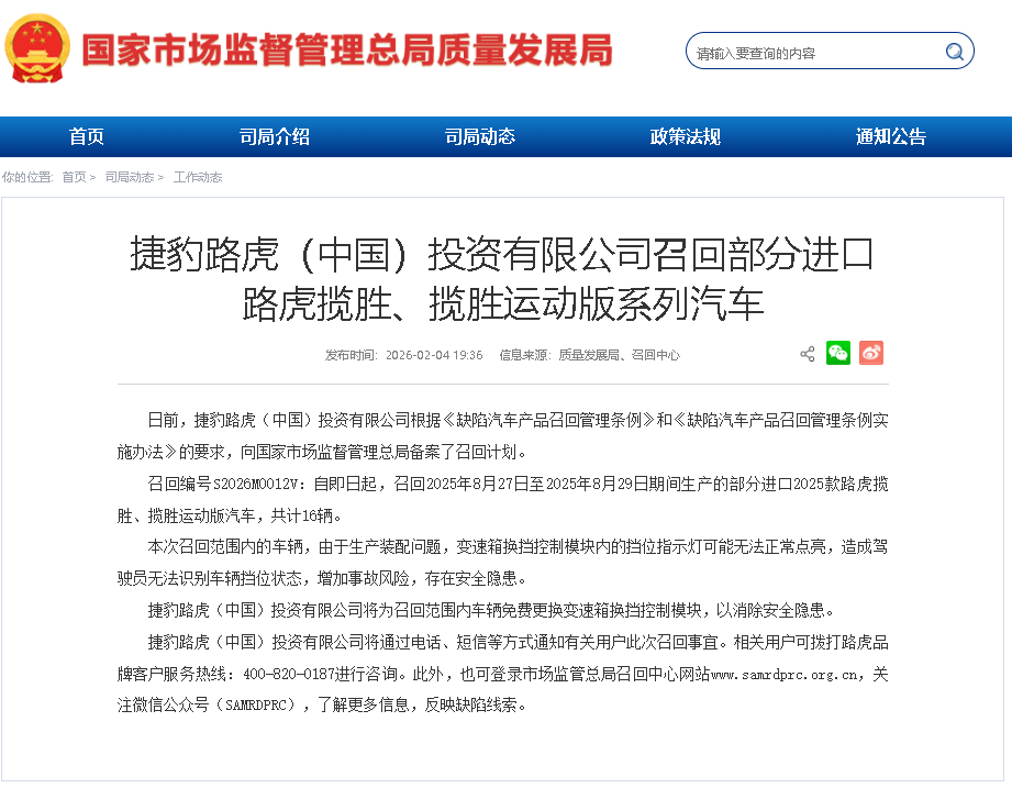 值得一提的是,这是本月捷豹路虎(中国)投资有限公司第二次宣布召回。2月4日,捷豹路虎(中国)投资有限公司自即日起,召回2025年8月27日至2025年8月29日期间生产的部分进口2025款路虎揽胜、揽胜运动版汽车,共计16辆。召回原因是本次召回范围内的车辆,由于生产装配问题,变速箱换挡控制模块内的挡位指示灯可能无法正常点亮,造成驾驶员无法识别车辆挡位状态,增加事故风险,存在安全隐患。针对以上缺陷,捷豹路虎(中国)投资有限公司将为召回范围内车辆免费更换变速箱换挡控制模块,以消除安全隐患。