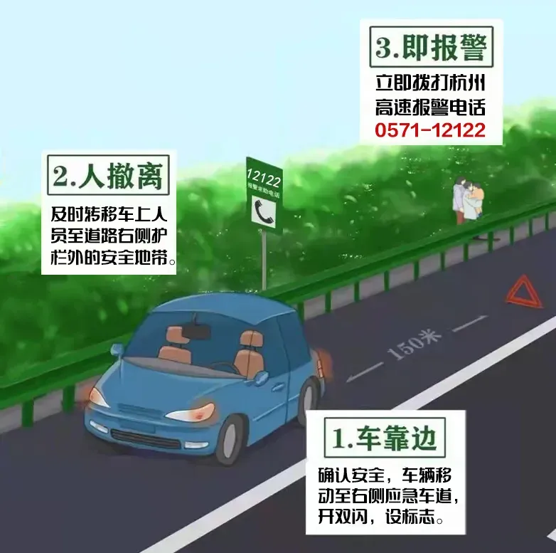 在高速上遇到故障或事故,牢记“车靠边、人撤离、即报警”,切勿在车道内逗留,人员迅速撤离到右侧护栏外,拨打电话12122报警求助。
